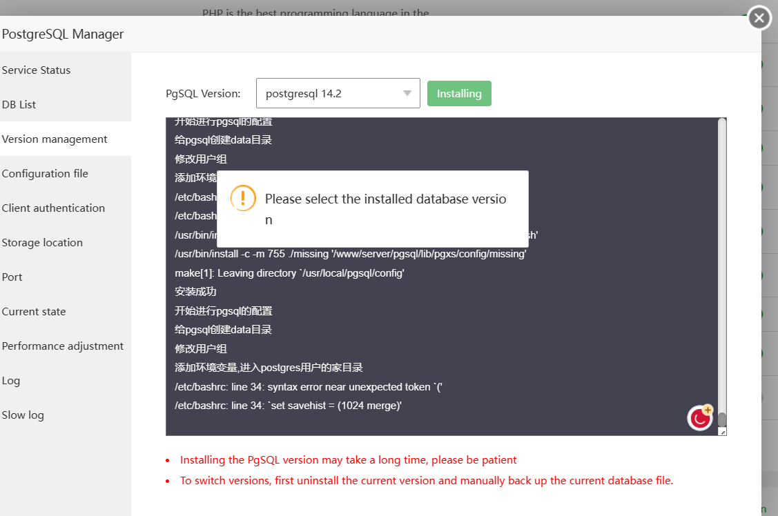 Hi, I installed PostgreSQL Manager from App Store. Then from settings, I installed postgresql 14.2 but installation get struck at some time and it started displaying this error again and again: