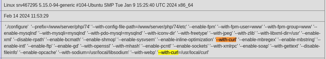 I'm trying to install php 7.4 with the custom curl directory using --with-curl=/path/to/curl. Installation works pretty well, but in the phpinfo configure command section --with-curl is added 2 times. one with the default directory, and 2nd with the custom directory.