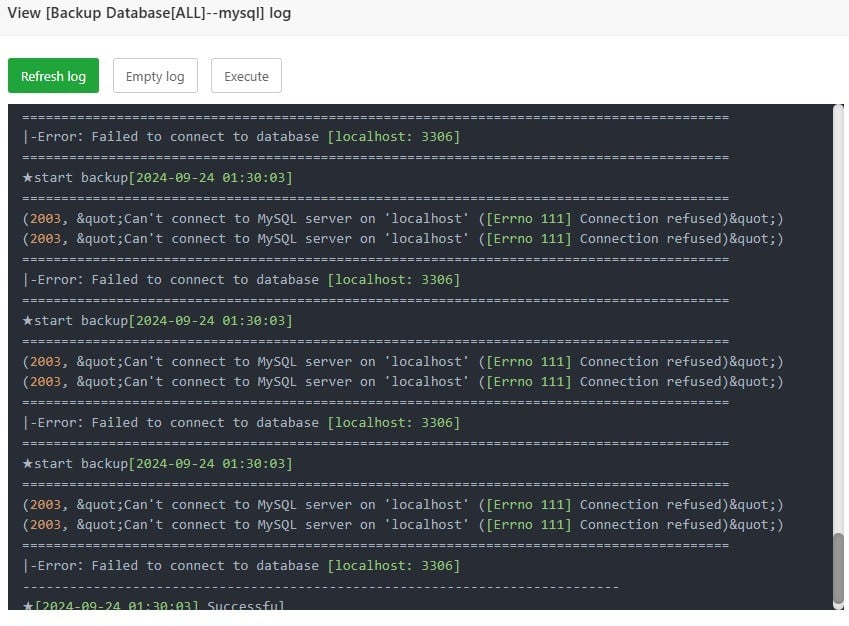 I am having problems with version 7.0.9, the database backup system is not running normally in the cron settings provided by aapanel. Here is the error log that occurs when running cron backup database all: