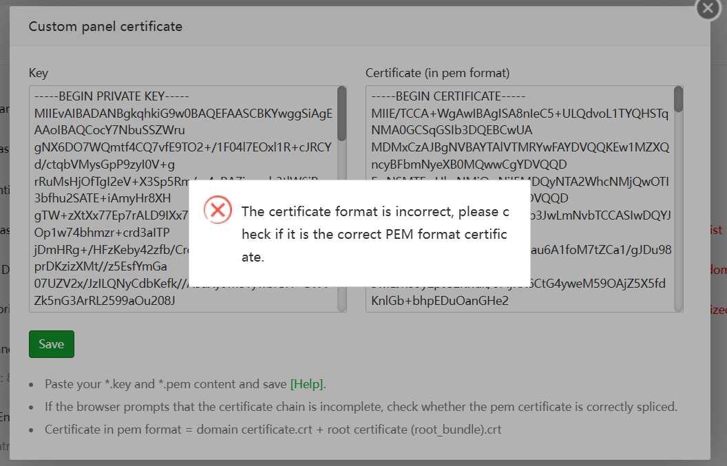 I have verified that the certificate is in the correct PEM format and tested its validity outside of aaPanel. The issue persists, despite the certificate working as expected in other environments. It seems that the panel might be having trouble recognizing the certificate, even though it meets the required format.