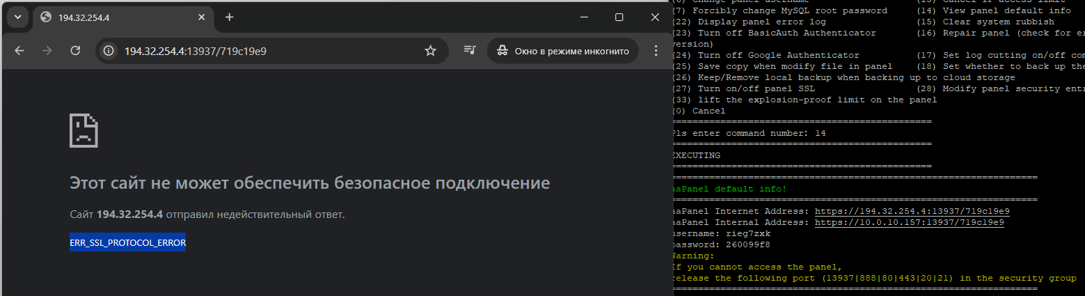 Hi. I have a problem. After installing the panel, I cannot access it. in the browser, I get the error ERR_SSL_PROTOCOL_ERROR. I tried to run sudo bt 27 after that I get the error ERR_CONNECTION_RESET when trying to open the panel via http. Tell me what to do?