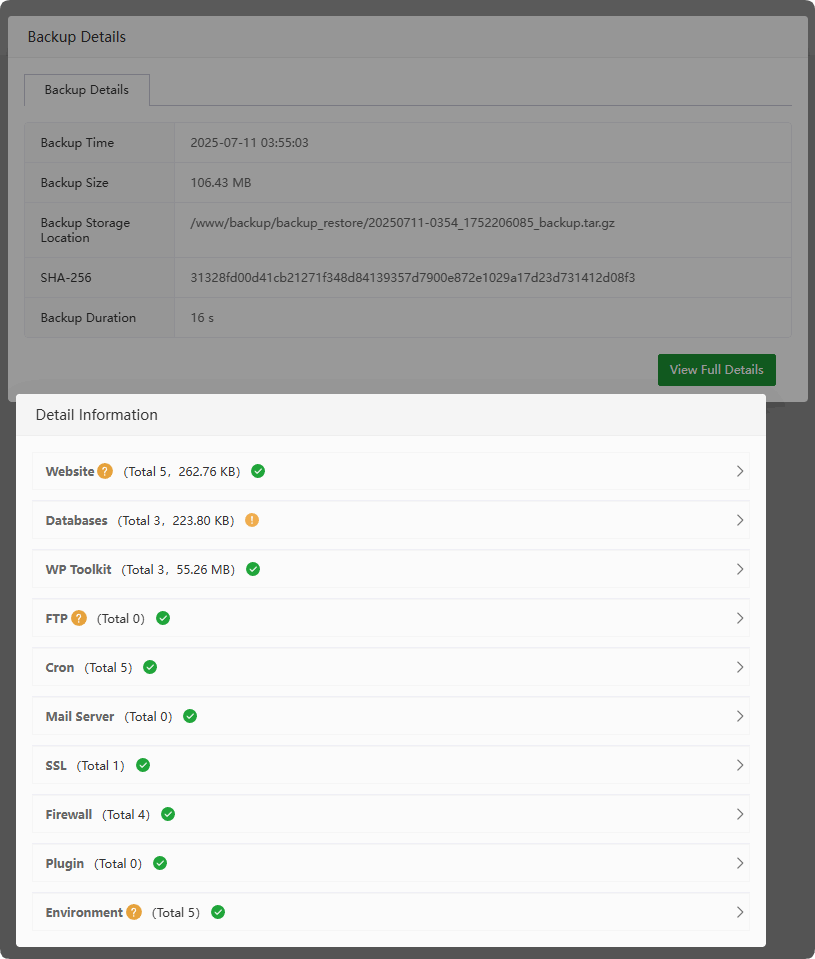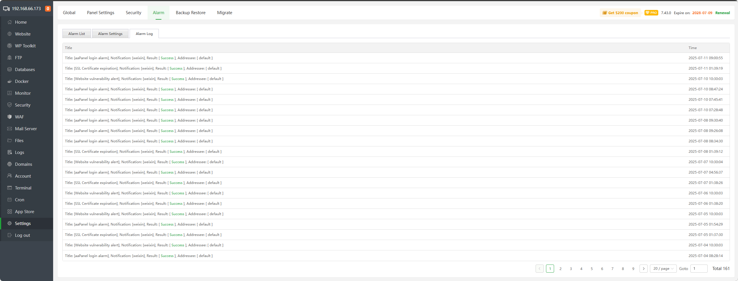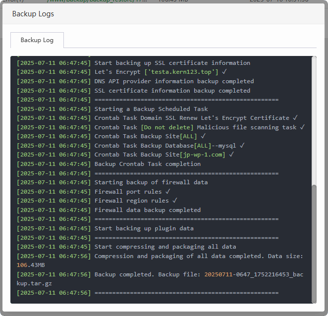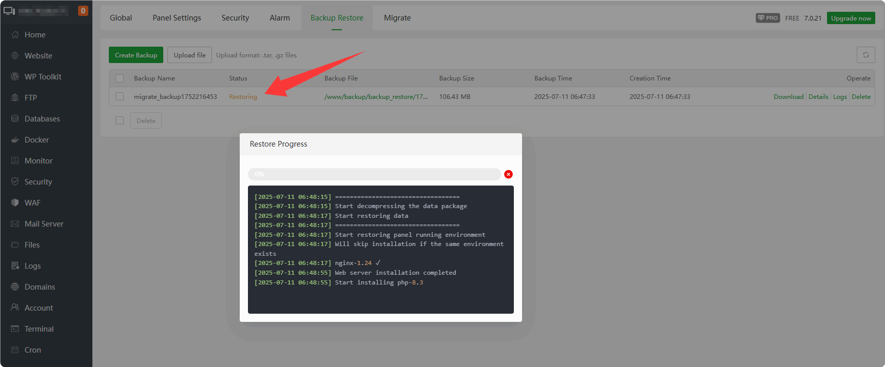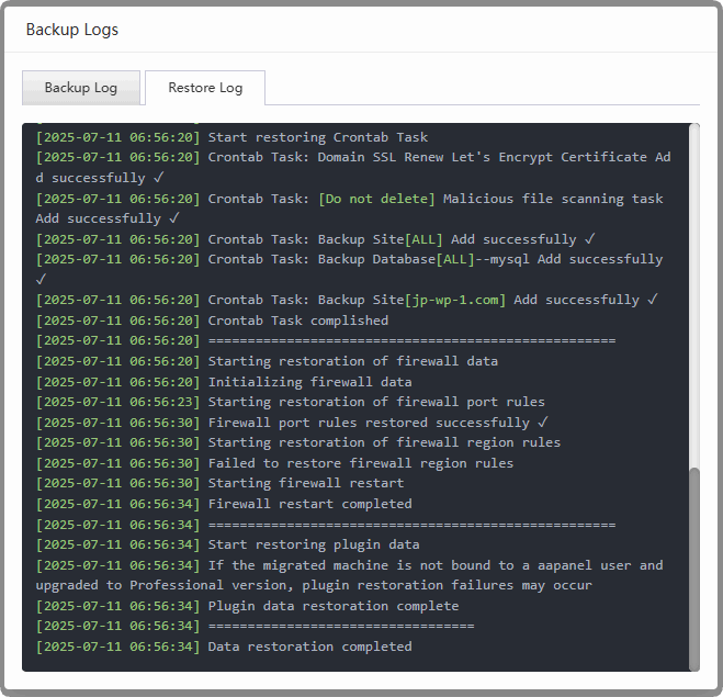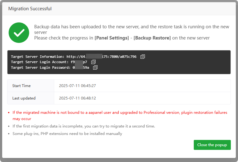 Please log in to the aaPanel of the target server according to the displayed information to check the restoration details: