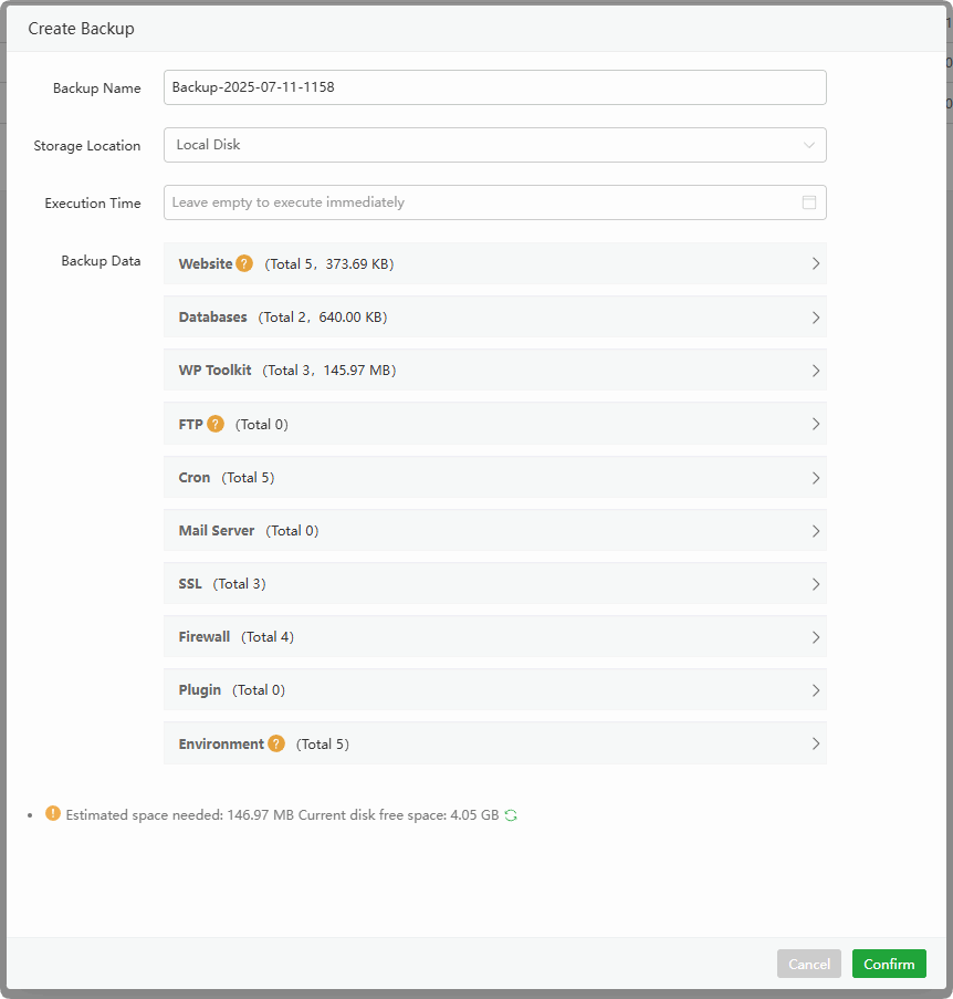 Backups require a relatively large amount of space, so please make sure there is enough space