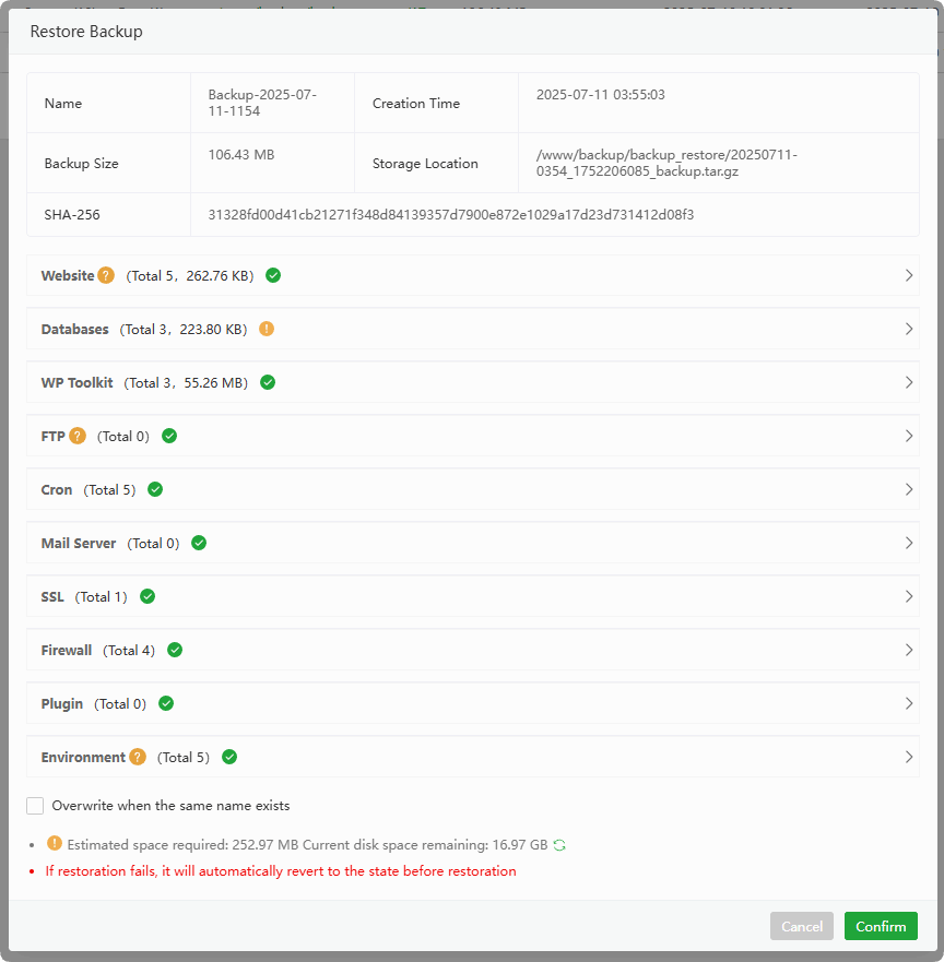 restore data. It is recommended to back up theserver snapshotbefore restoring to avoid data lossOverwrite when the same name exists: When selected, if there is the same data, it will be overwritten. Please choose carefully.