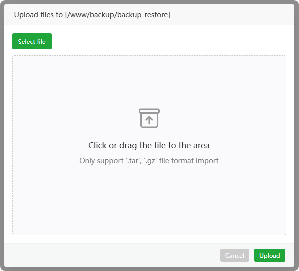 Upload file :Upload backup file. It also supports directly placing the file into the