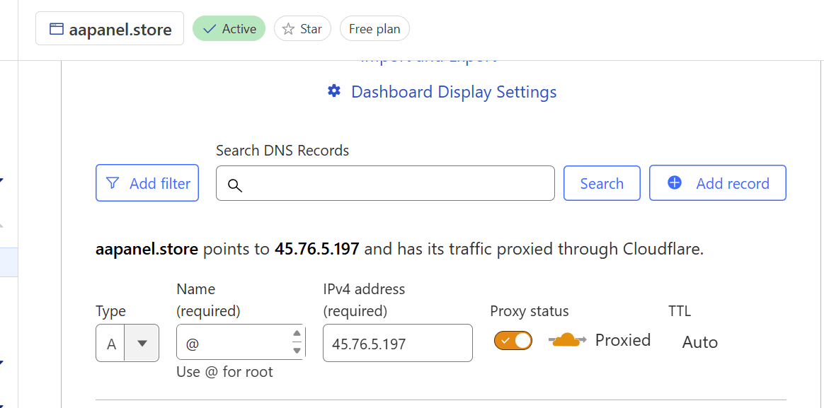 Resolve domain names through cloudflare and enable proxy Generally, we need to resolve www. and the main domain name, such as aapanel.com, www.aapanel.com
