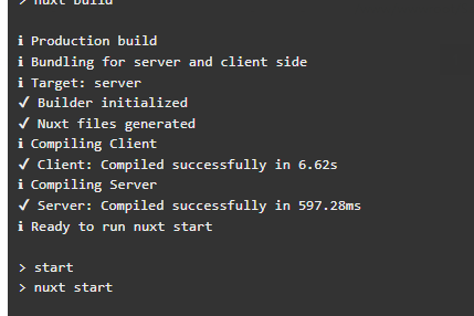 temp Hello, I have went ahead and installed Node Manager and PM2 to be able to use my Nuxt-JS Project, but It's not able to run nuxt start for some odd reason, using nuxt build has worked fine, but using nuxt start does not start the application.