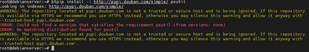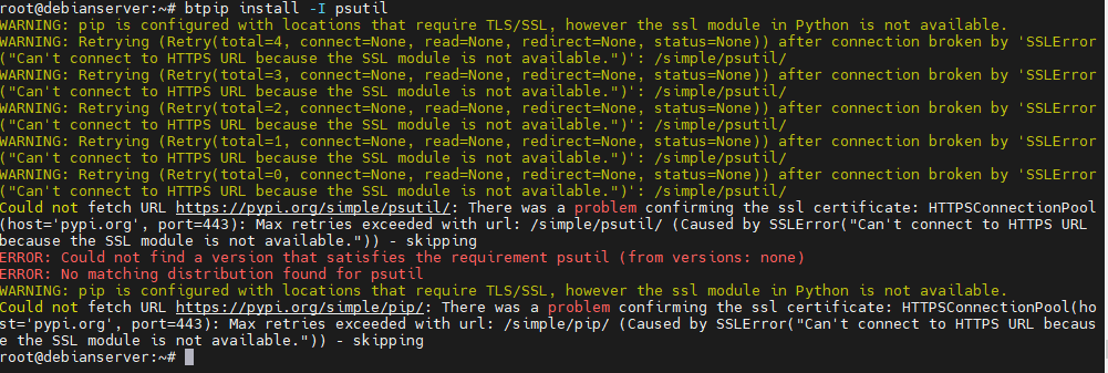 aaPanel_Jose aaP_alondolinski It may be that there is a problem with your local ca, try to specify an http source for installation btpip install -i http://pypi.douban.com/simple/ psutil btpip install -i http://pypi.douban.com/simple/ gevent