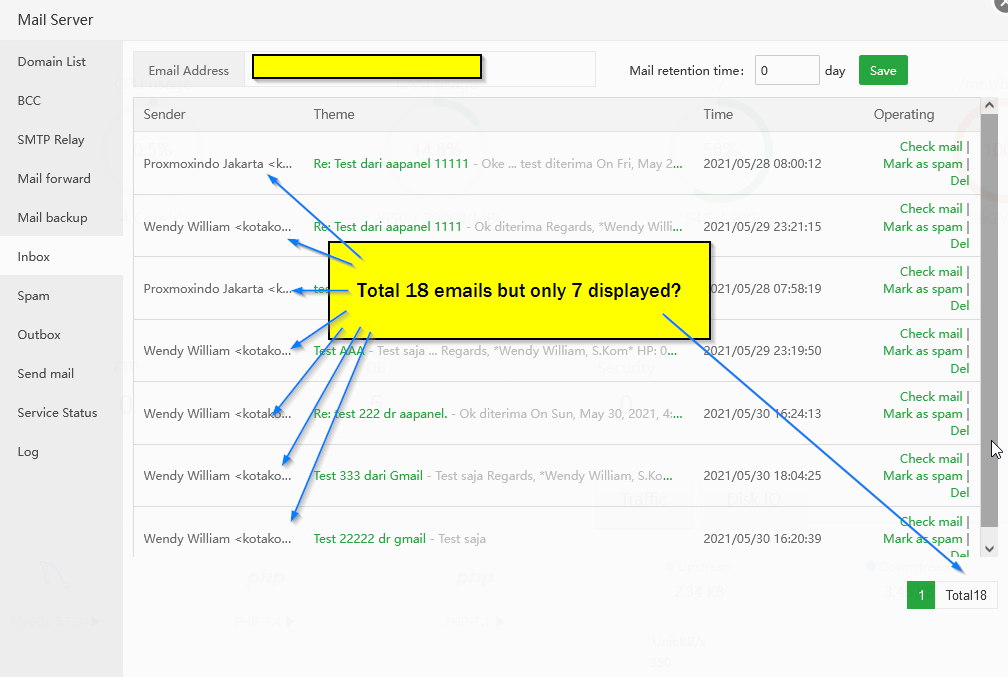 aaP_kotakomputer.ceo Aapanel has Mail Server - Inbox, but new email not exists in this Inbox. When I open RoundCube then I can see all of the new emails. Mail Server - Inbox has 18 emails but only 7 displayed. Centos 7.9, Aapanel 6.8.21, Mail Server 4.2