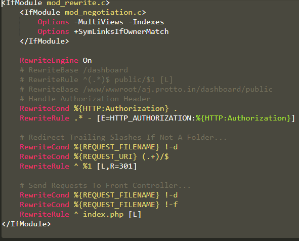 The framework ships with a public/.htaccess file that is used to allow URLs without index.php. If you use Apache to serve your Laravel application, be sure to enable the mod_rewrite module.