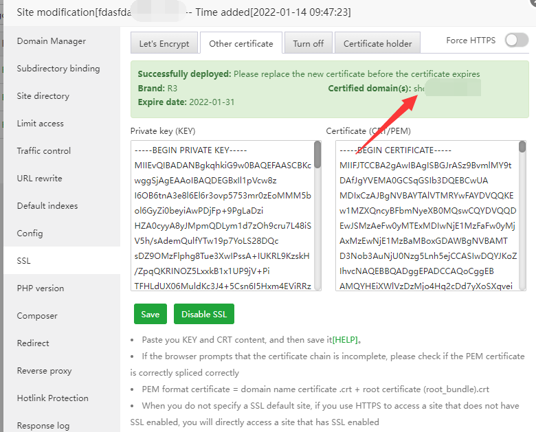You can see the domain name verified by the SSL certificate in the website management