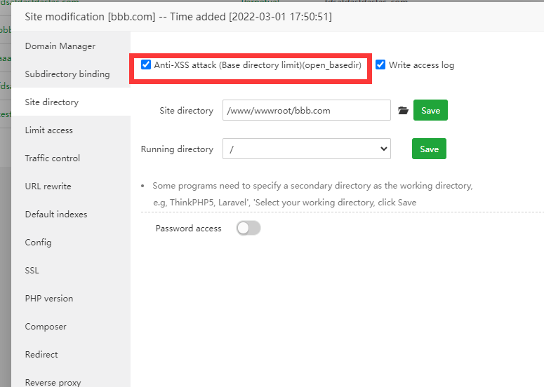 aaPanel_Jose CristianJG There are two workarounds: Turn off the cross-site function on the website management page Add the directory you want to access in .user.ini Turn off the cross-site Add the directory you want to access in .user.ini