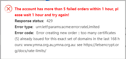 TrK The 1 hour timeout is only valid if your certificates validation failed 5 times in an hour, but for duplicate certificates you can't create more than 5 certificates per week on a same domain, so you gotta wait for a week to issue a new certificate for the same domain. More details can be found on https://letsencrypt.org/docs/rate-limits/