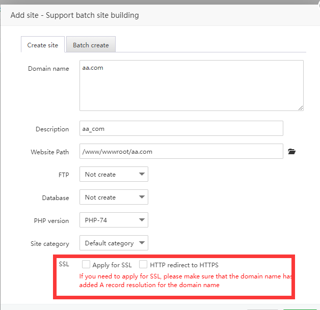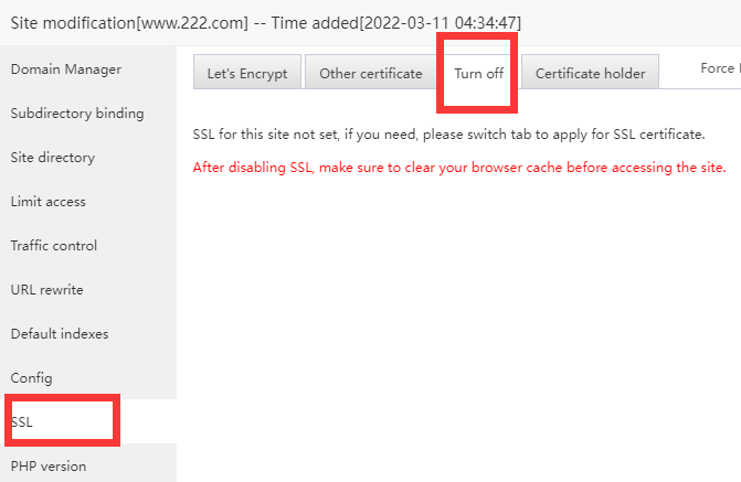 aaPanel_Kern aaP_linli19950904 Hello, don't tick Apply for SSL and HTTP redirect to HTTPS when establishing the website If it has been established, you can cancel it here