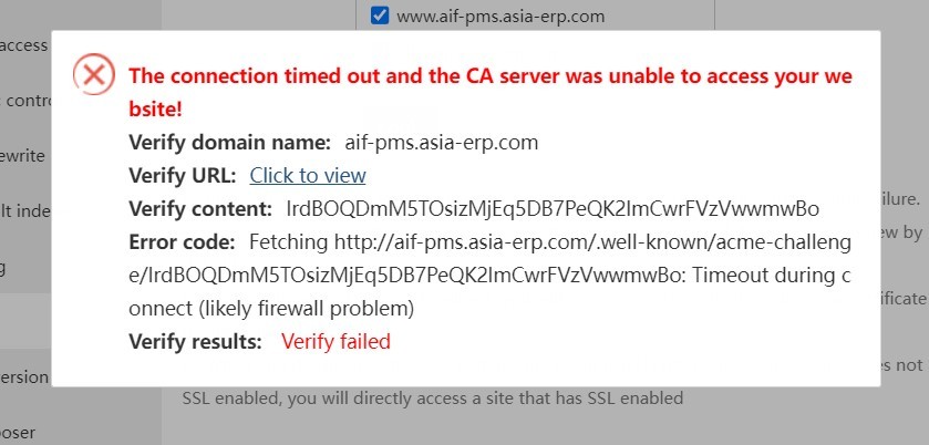 aaPanel_Kern aaP_infowebsite Hello, to apply for a certificate, you need to access your port 80, please open it, and then apply again.