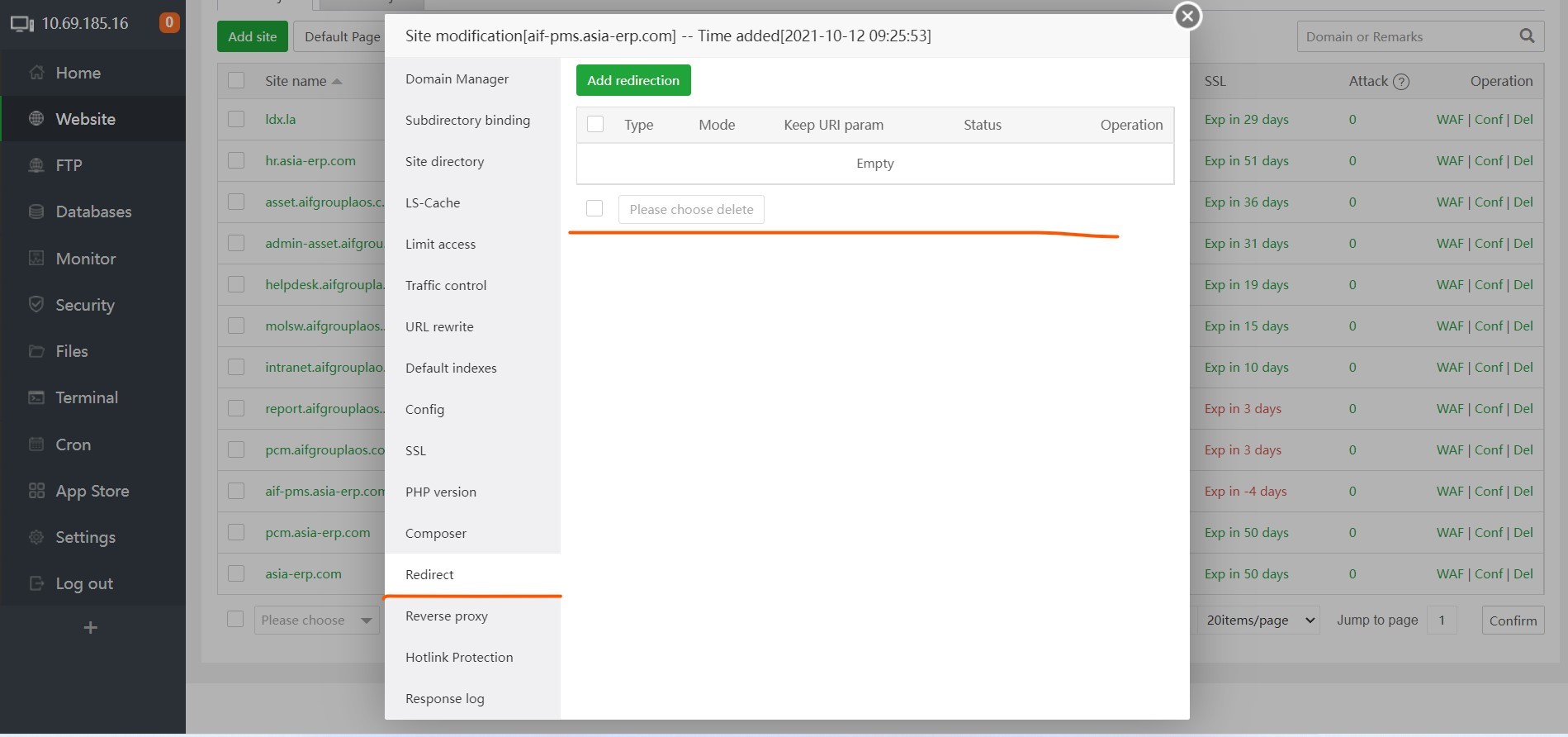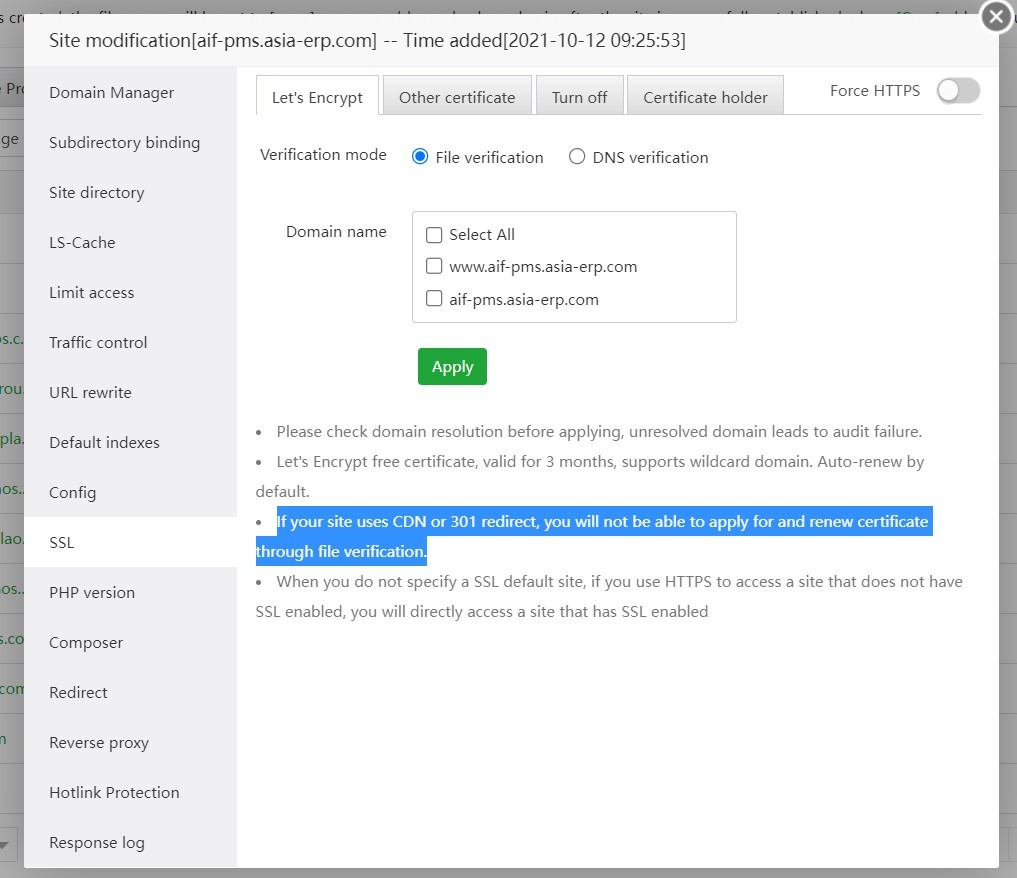aaPanel_Kern aaP_infowebsite Hello, you can temporarily disable 301 redirection here. If you use CDN, it is recommended to choose DNS verification method to apply for an SSL certificate.