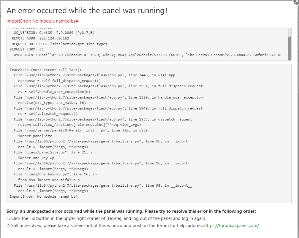 aaPanel_Kern aa9000nb Hello, from the screenshot you are prompted to use py2.7.5, our panel needs to run on Python 3.7.9, Did you change the file, or something went wrong during the installation, It is recommended that you overwrite the installation once.