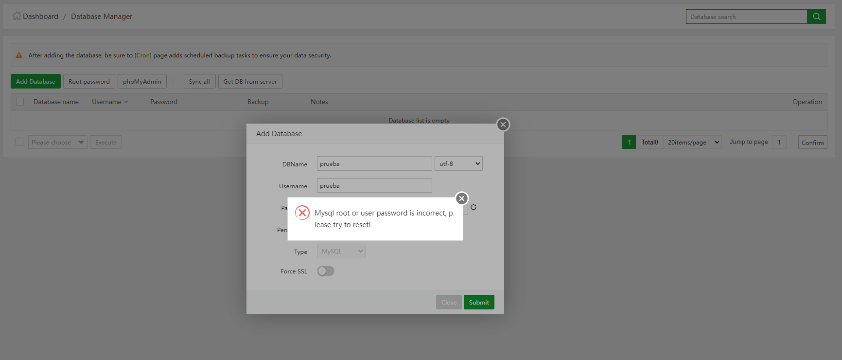 Cuando intento crear una base de datos en aapanel en mi vps server con debian 11 no puedo porque no me reconoce ni el usuario ni la contraseña