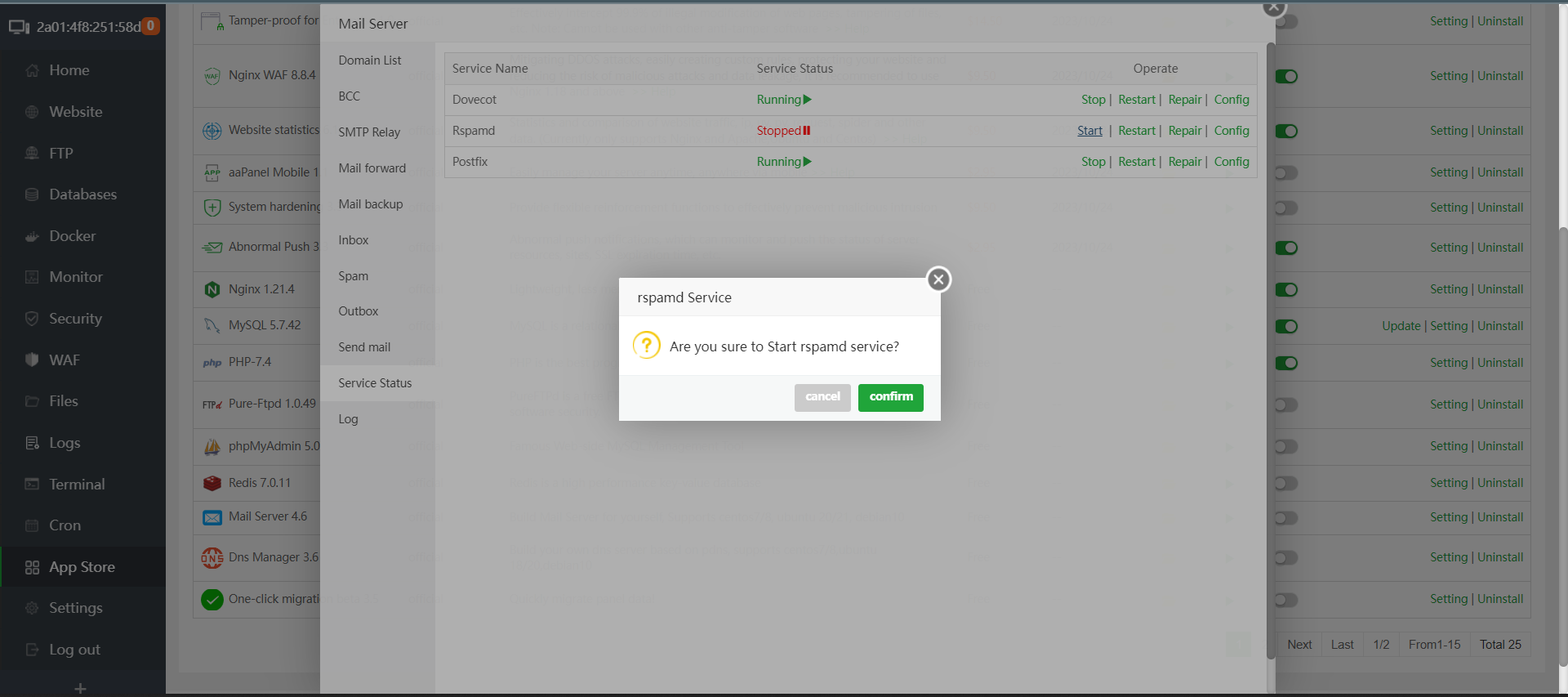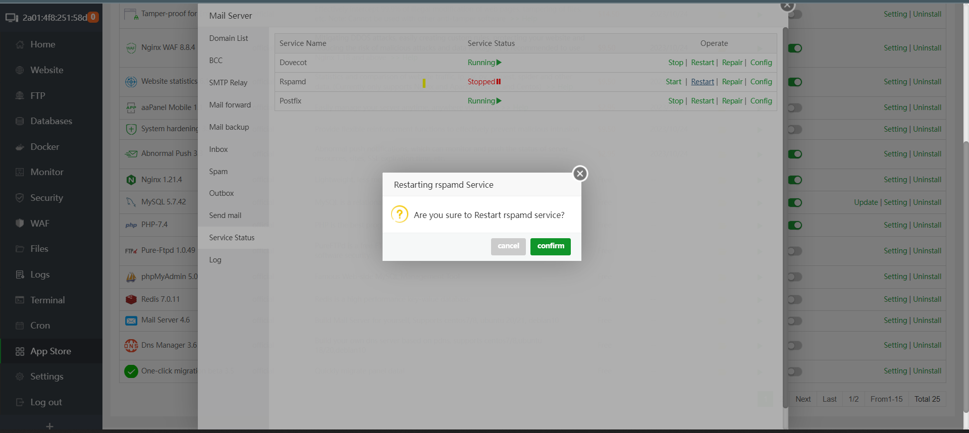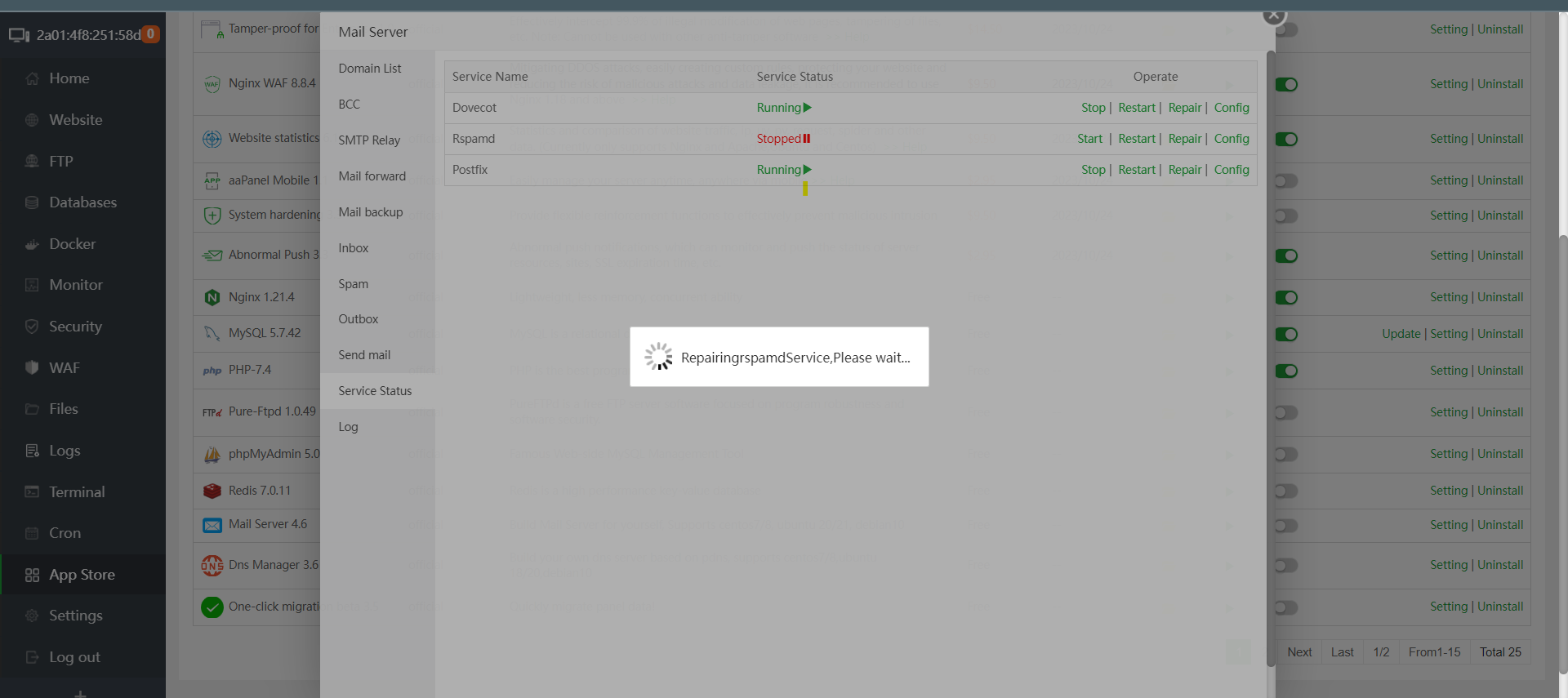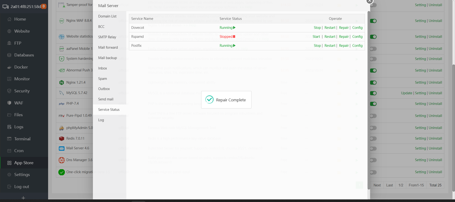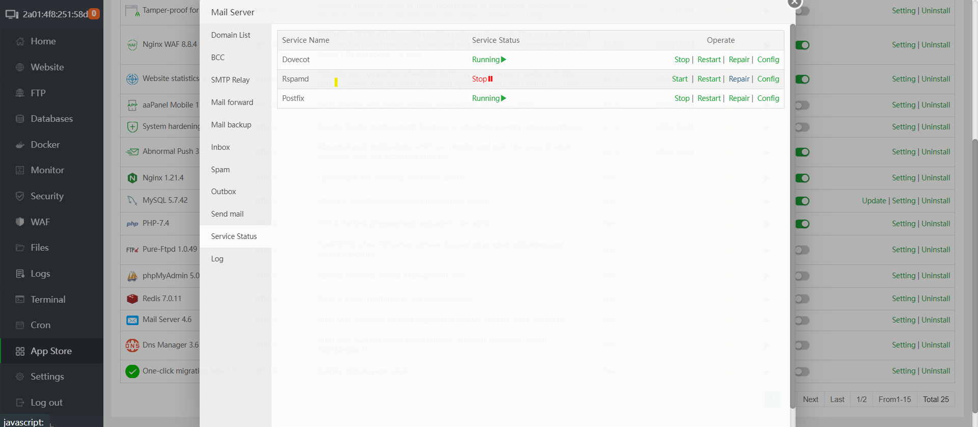 And i need to manually restart server from panel and start dovecot (sometimes its autostarted) to make the mail server working again.