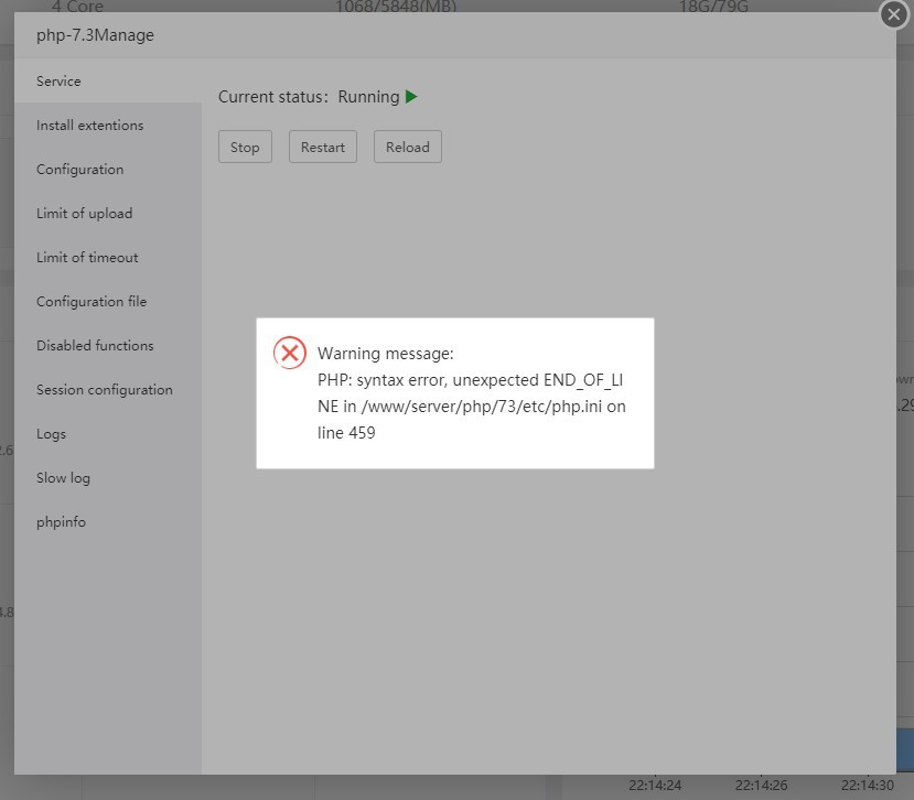 cekotechnology Hello jose, My PHP 7.3 cannot restart :').. I See this error make upload_max_filesize canot changed (sorry bad english) please login to my panel again, my acess panel and root not changes 🙂