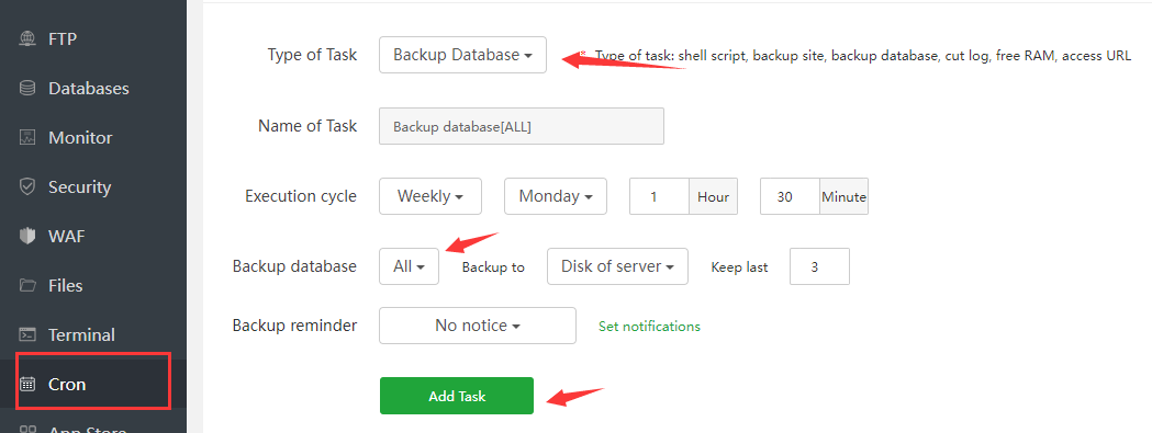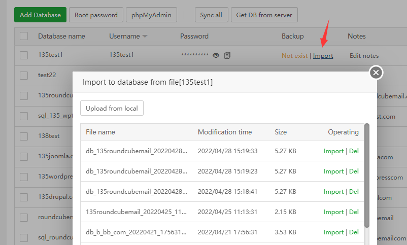 You can also back up by clicking the Backup button on the "databases" management interface.