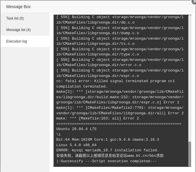 Hello, there is insufficient memory. Installing MariaDB 10.7 requires 6-8G memory. You can replace the database with other versions, or increase the memory/swap