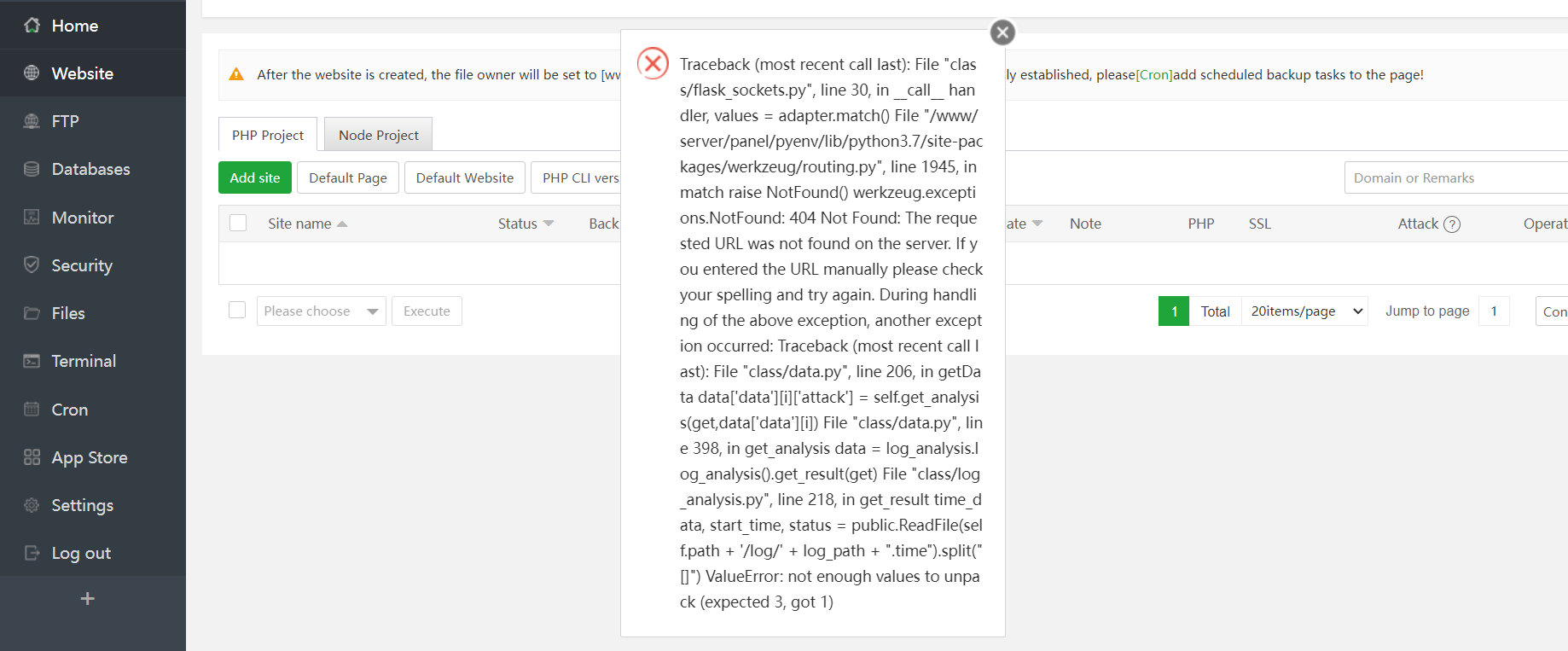 Traceback (most recent call last): File "class/flask_sockets.py", line 30, in call handler, values = adapter.match() File "/www/server/panel/pyenv/lib/python3.7/site-packages/werkzeug/routing.py", line 1945, in match raise NotFound() werkzeug.exceptions.NotFound: 404 Not Found: The requested URL was not found on the server. If you entered the URL manually please check your spelling and try again. During handling of the above exception, another exception occurred: Traceback (most recent call last): File "class/data.py", line 206, in getData data['data']['attack'] = self.get_analysis(get,data['data']) File "class/data.py", line 398, in get_analysis data = log_analysis.log_analysis().get_result(get) File "class/log_analysis.py", line 218, in get_result time_data, start_time, status = public.ReadFile(self.path + '/log/' + log_path + ".time").split("[]") ValueError: not enough values to unpack (expected 3, got 1)