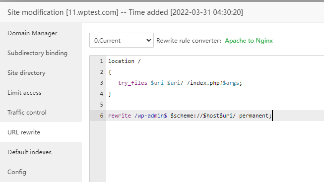 i eliminated the "#" in front of the line "include /www/server/panel/vhost/rewrite/example.com.conf;" if not you may experience a constant error of 404 Not Found nginx. I suffered this alot, because in the making of this video (https://www.youtube.com/watch?v=WToZBDNMBks) , @WP Academy added that hash in front of the line, don't follow that!!! and yes!! WP ACADEMY THANKS ALOT FOR THE VIDEO