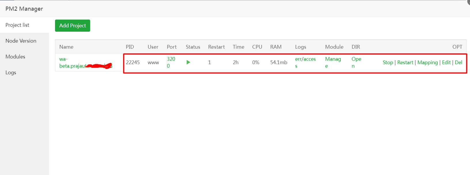 Install PM2 Manager 5.1 Click Setinng to enter the pm2 Manager management interface, first install the required Node Version, and then go to the Project list to create a project.