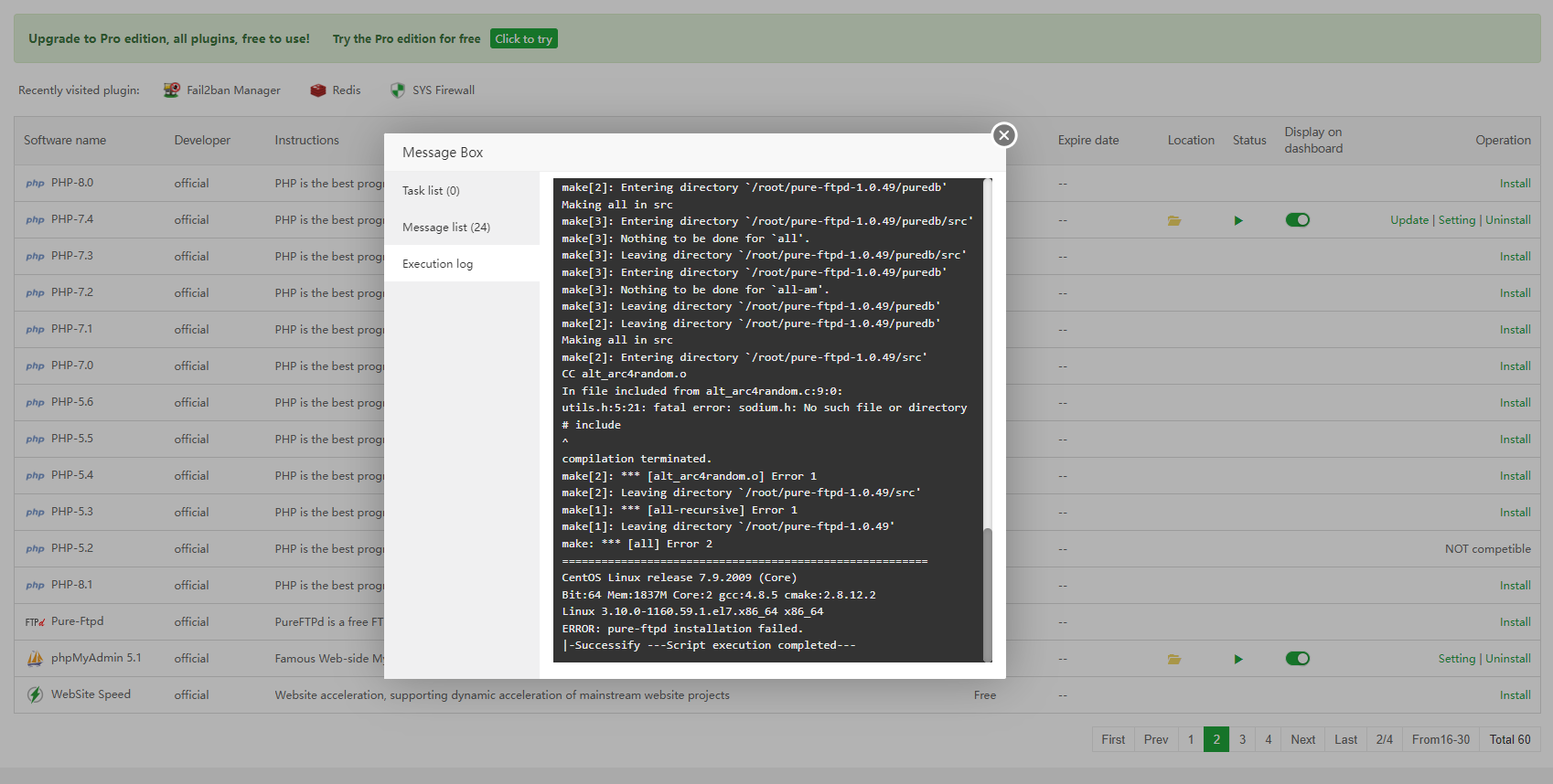 aaPanel_Kern huanvm Hi, try to execute the following command manually and reinstall pure-ftpd again yum install libsodium-devel -y