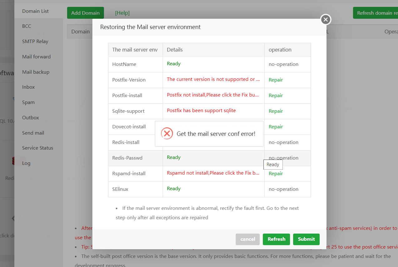 i try to use the "fix" and repair function of the mailserver but dont work. Can't also repair rspamd