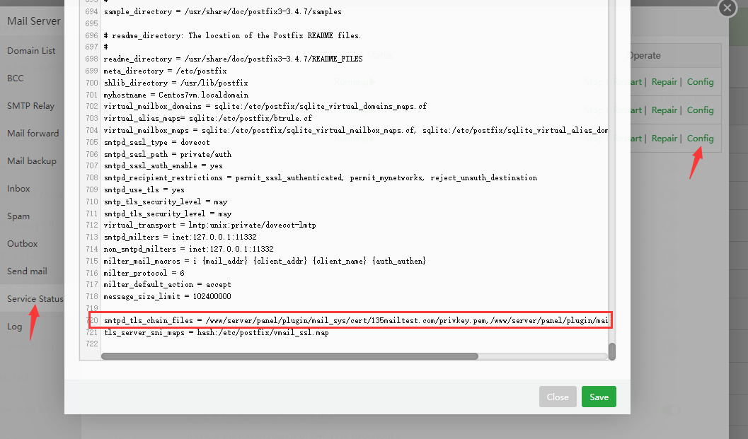 Change to: smtpd_tls_chain_files = /www/server/panel/plugin/mail_sys/cert/135mailtest.com/privkey.pem,/www/server/panel/plugin/mail_sys/cert/135mailtest.com/fullchain.pem