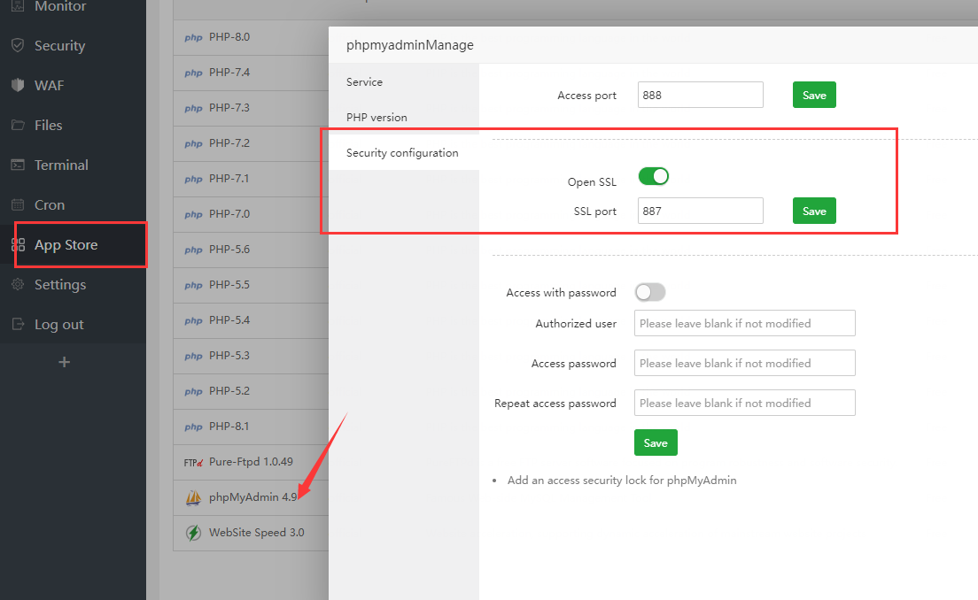 The panel launches php my admin on port 888, not 887. I can't see anywhere I can change the port. Both 888 and 887 run without SSL.