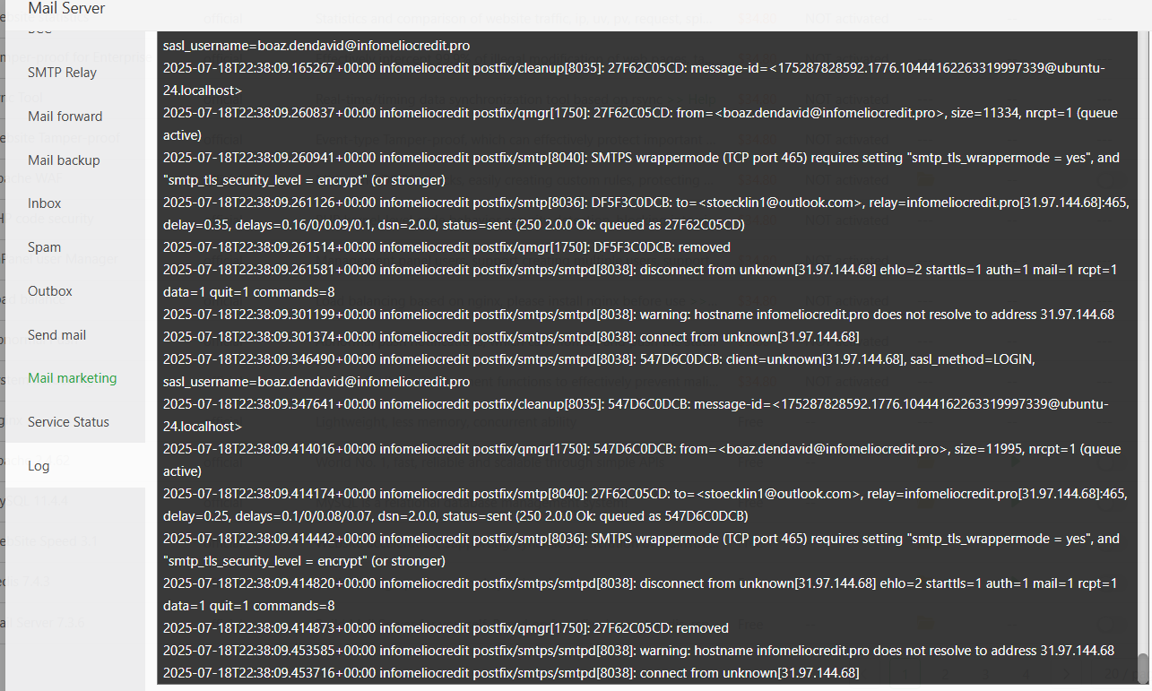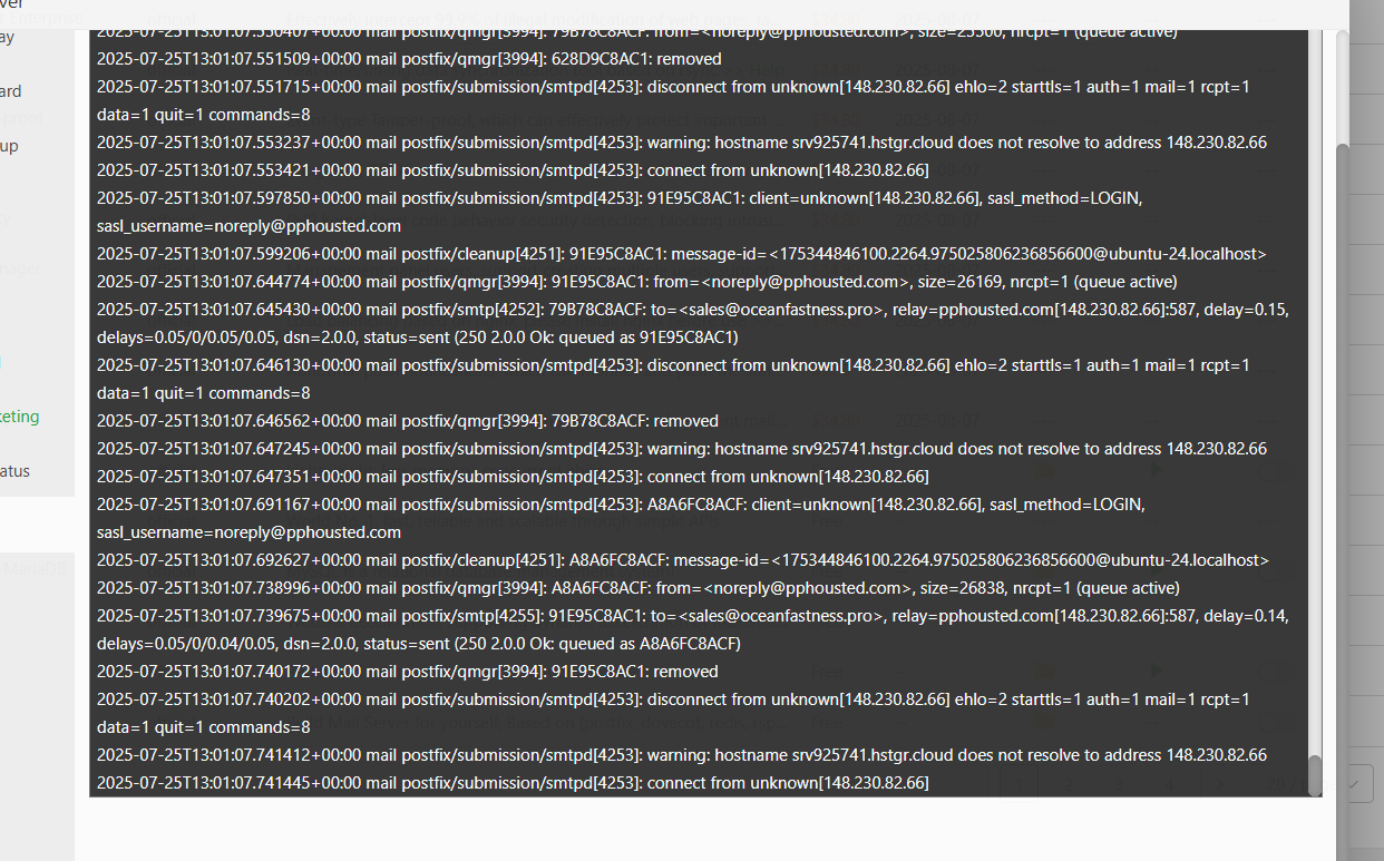 It's clear that hostnamesrv925741.hstgr.cloud isn't connecting to 148.230.82.66. If you're using Hostinger like I am, I recommend changing the IP address in the Hostinger panel -> VPS -> IP address. Change it from hostnamesrv925741.hstgr.cloud to your SMTP domain name in the reverse DNS section. It may take a few minutes, hours, or even 24-48 hours for the change to take effect.