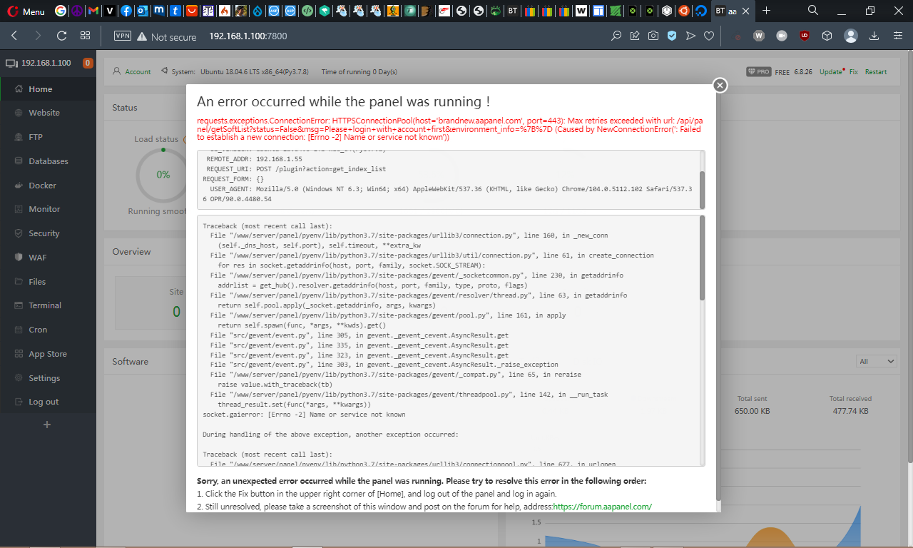 aaPanel_Kern Vereato Hi, is the problem solved? It's a network problem Unable to connect to aapanel's server. Please check /etc/resolv.conf file if nameserver is set If not please use SSH tool to set nameserver : echo "nameserver 8.8.8.8" >> /etc/resolv.conf echo "nameserver 1.1.1.1" >> /etc/resolv.conf If there are settings, please ping and curl brandnew.aapanel.com ping brandnew.aapanel.com curl -v https://brandnew.aapanel.com