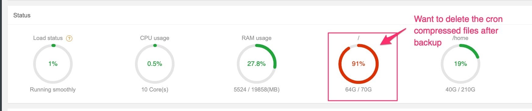 My root directory / is sitting at 91% mostly because I have 4 cron backup jobs which are pushing a total of 12GB to google drive.