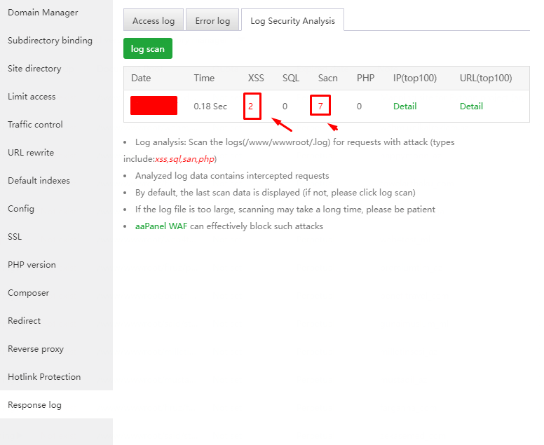 aaPanel_Kern AmFiDev Direct clearing is not supported, you can clear the access log of this site. then manually scan once The log files of the site are stored in the path of the domain name command: /www/wwwlogs