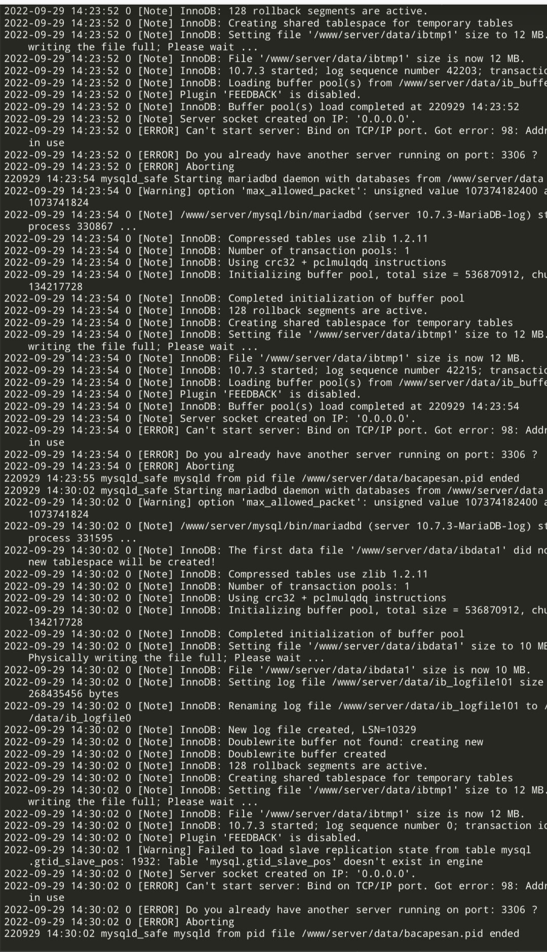 aaPanel_Kern Hamka Logs suggest that port 98 that you modify has been used. Replace it with other unused ports. The default is 3306
