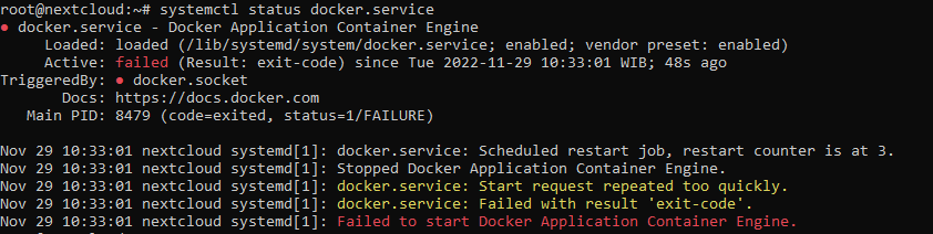 Process: 11061 ExecStart=/usr/bin/dockerd -H fd:// --containerd=/run/containerd/containerd.sock (code=exited, status=1/FAILURE)