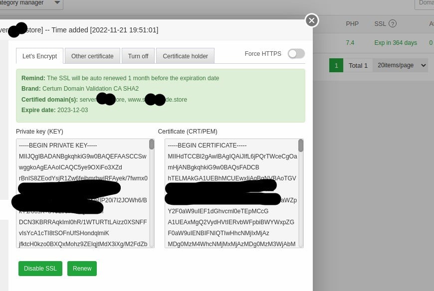 Now, no matter what I tried to activate the new certificate, the browser and other internet services that check the certificate show the the first certificate, but inside the panel, apparently, the new certificate has been implemented!!