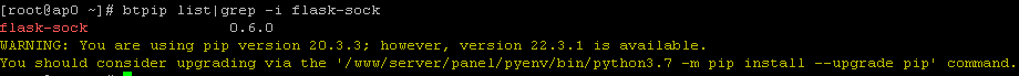 aaPanel_Kern thiagotgc Hi there, using the command flask-sock exists? btpip list|grep -i flask-sock If there is no manual installation: btpip install flask-sock bt restart