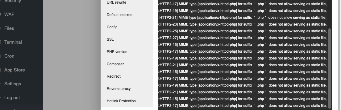 2023-02-05 23:39:17.031083 [ERROR] [17196] [:62445:HTTP2-15] MIME type [application/x-httpd-php] for suffix '.php' does not allow serving as static file, access denied!