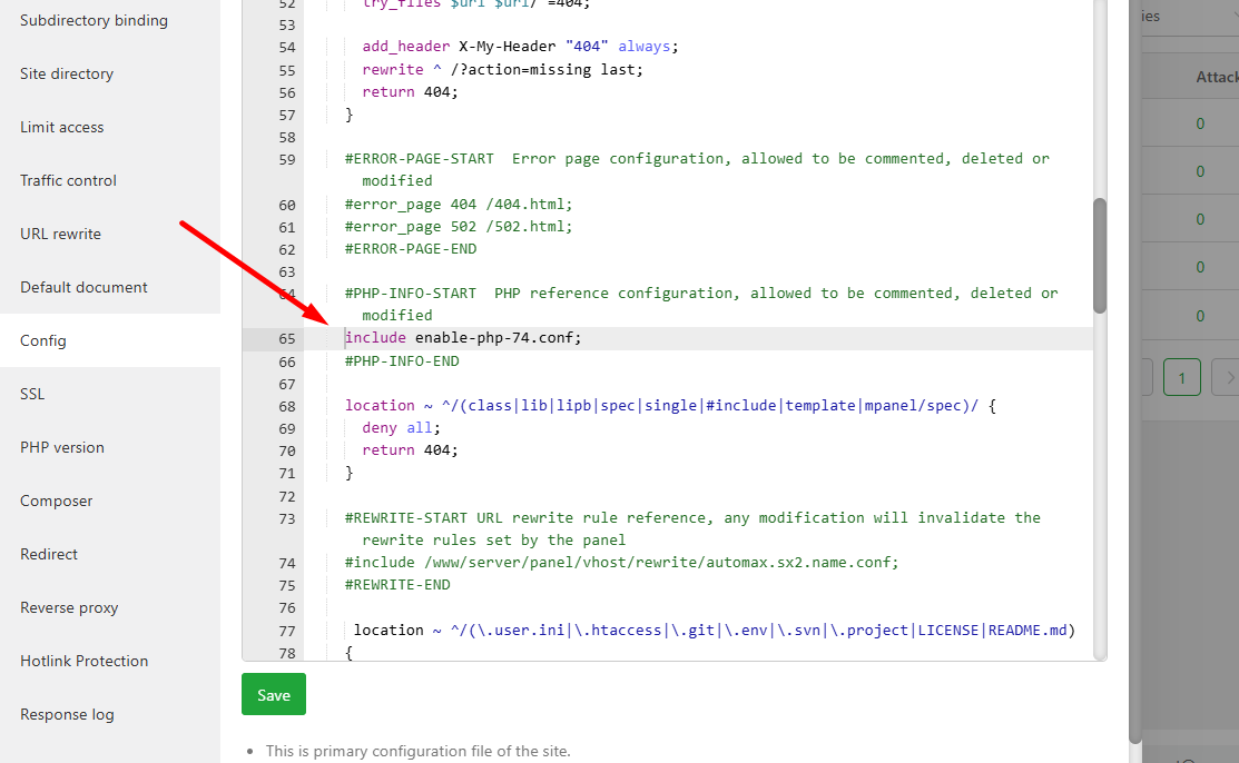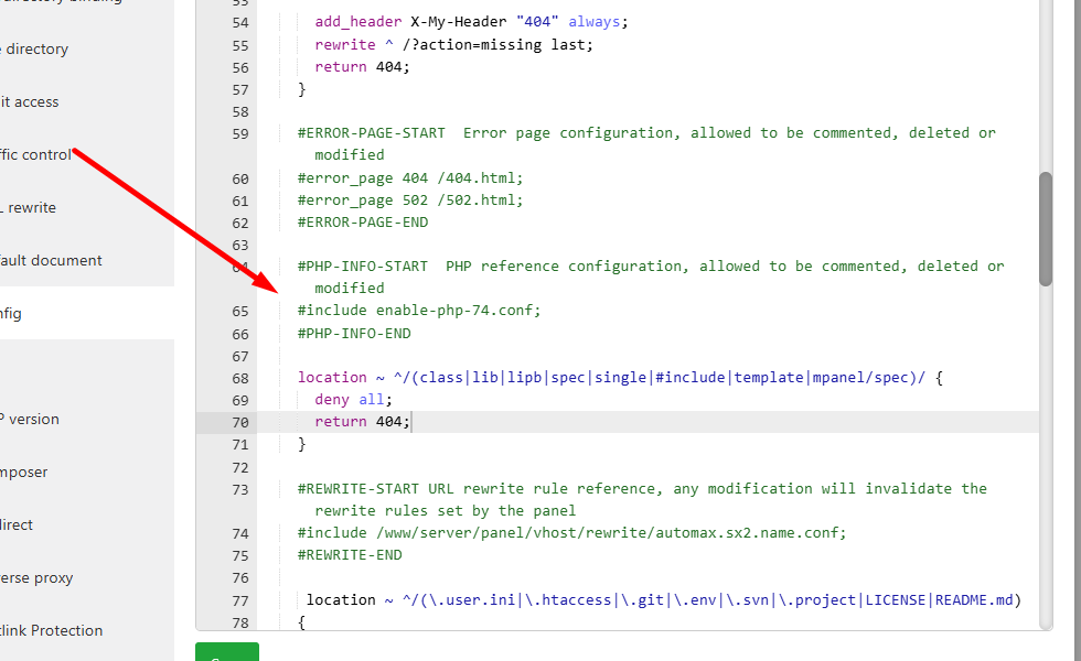 PHP support remains active, and the line include enable-php-74.conf; is not commented out automatically.