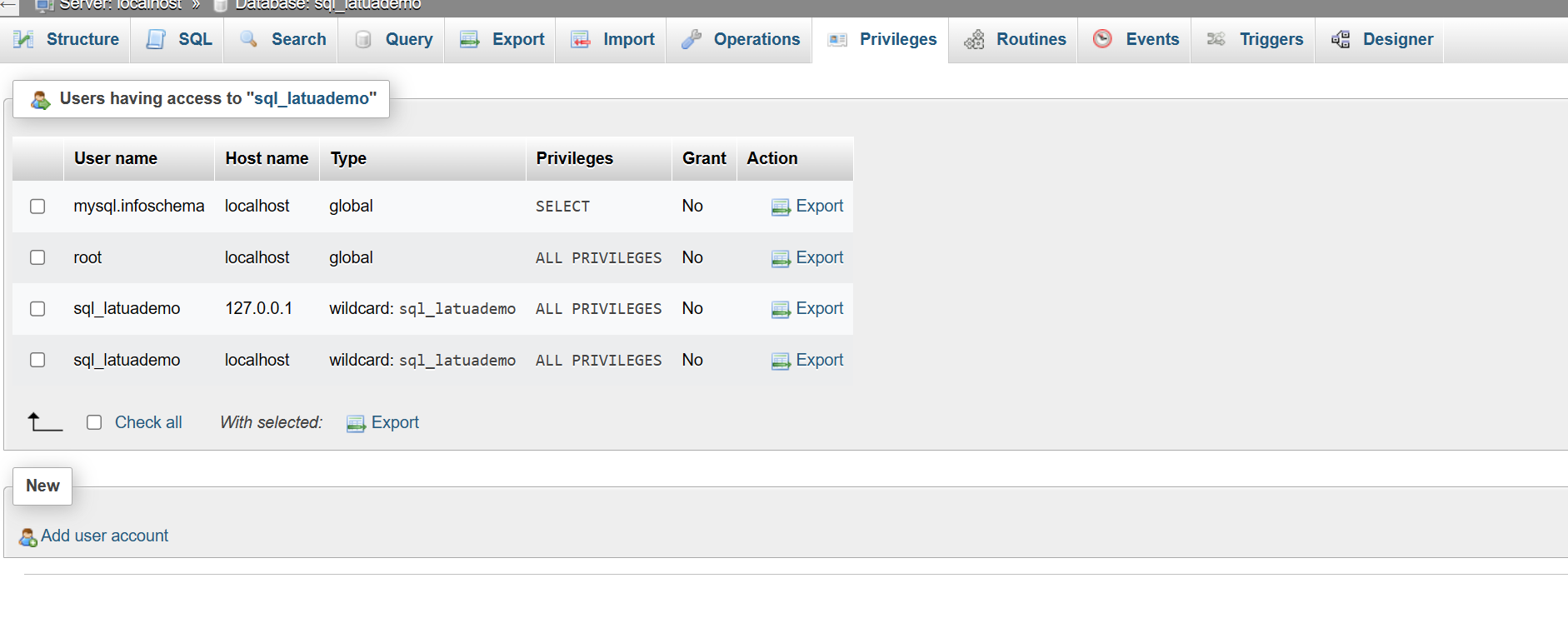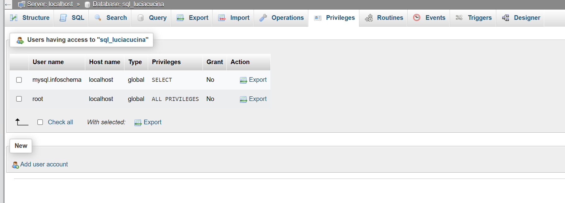 i have old database with name sql_namedb with user sql_namedb but now when i try to do it i don't have the user associated to the related db