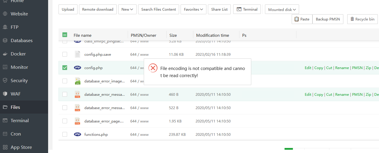 I rechecked the encoding of the files. I noticed that this happens to files that have ANSI encoding, and by changing them to UTF8, I was able to edit the file without displaying an error. I think this type of file should be added somewhere in the ace editor settings for editing.