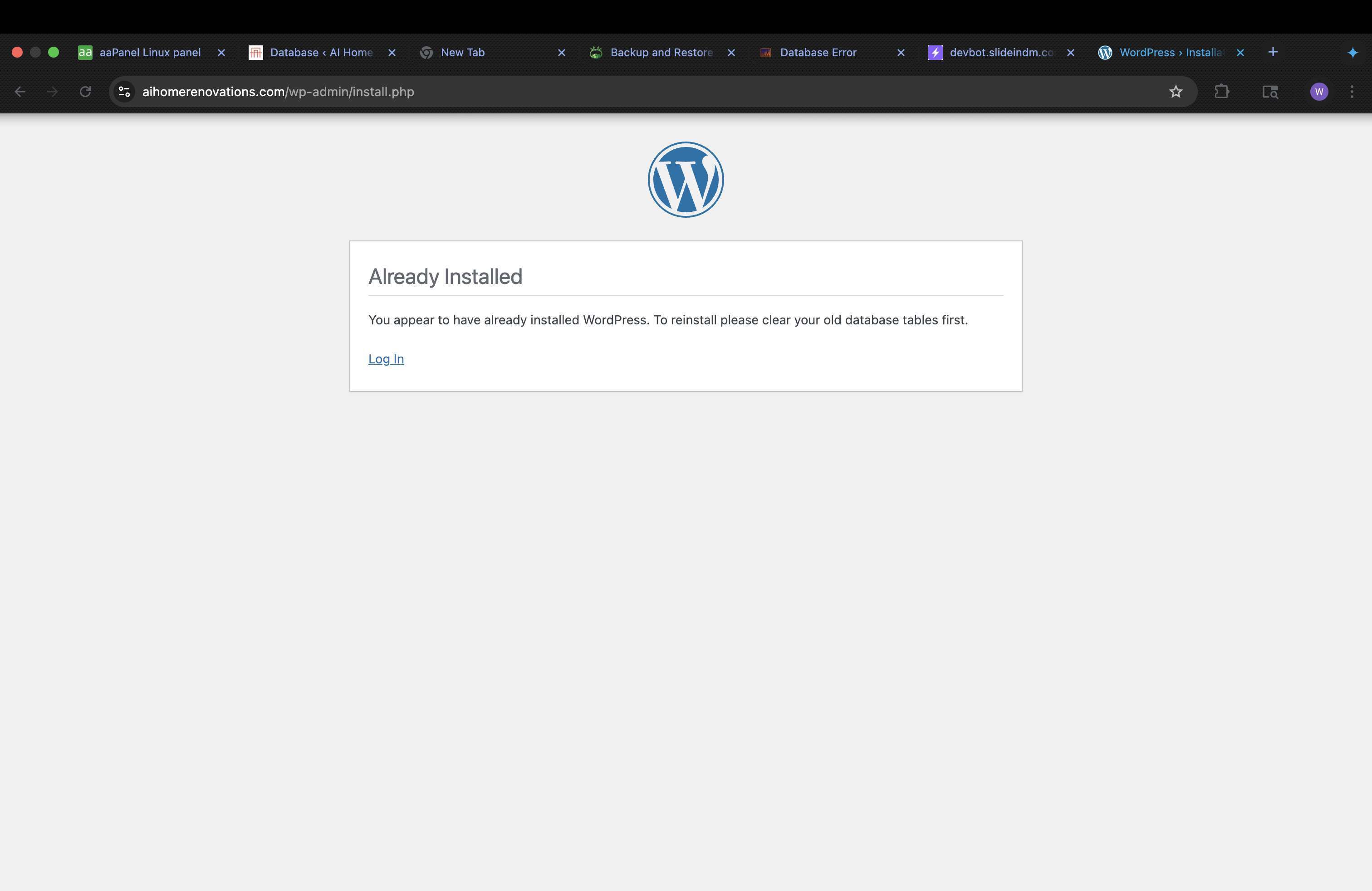 I reinstalled wordpress, on one site and some how get one it up and running - but when i try to navigate to that site it gives me "Already Installed