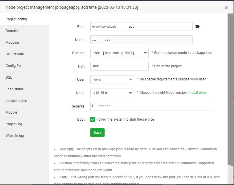 On PM2, once you changed the Node version to the latest (I'm on version 18) and you add the modules (one by one and click install), clicking save should be successfully create the project.