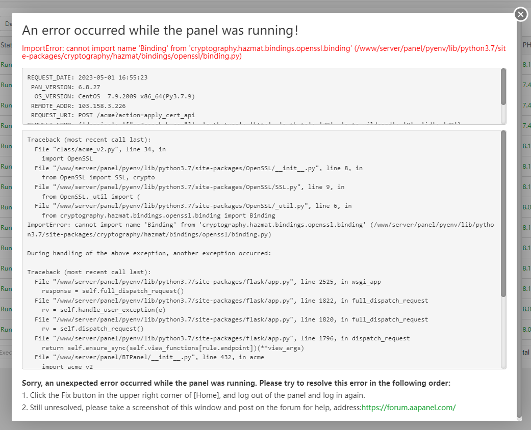 aaPanel_Kern shajal Hello, is it normal to use the ssh tool to execute the command and try again? mv /www/server/panel/pyenv/lib/python3.7/site-packages/OpenSSL /tmp/OpenSSL_bak btpip install pyOpenSSL bt reload