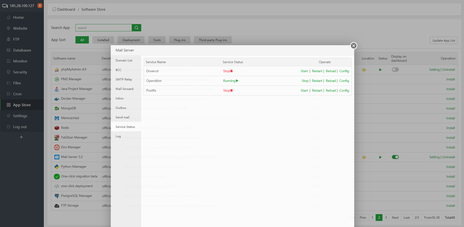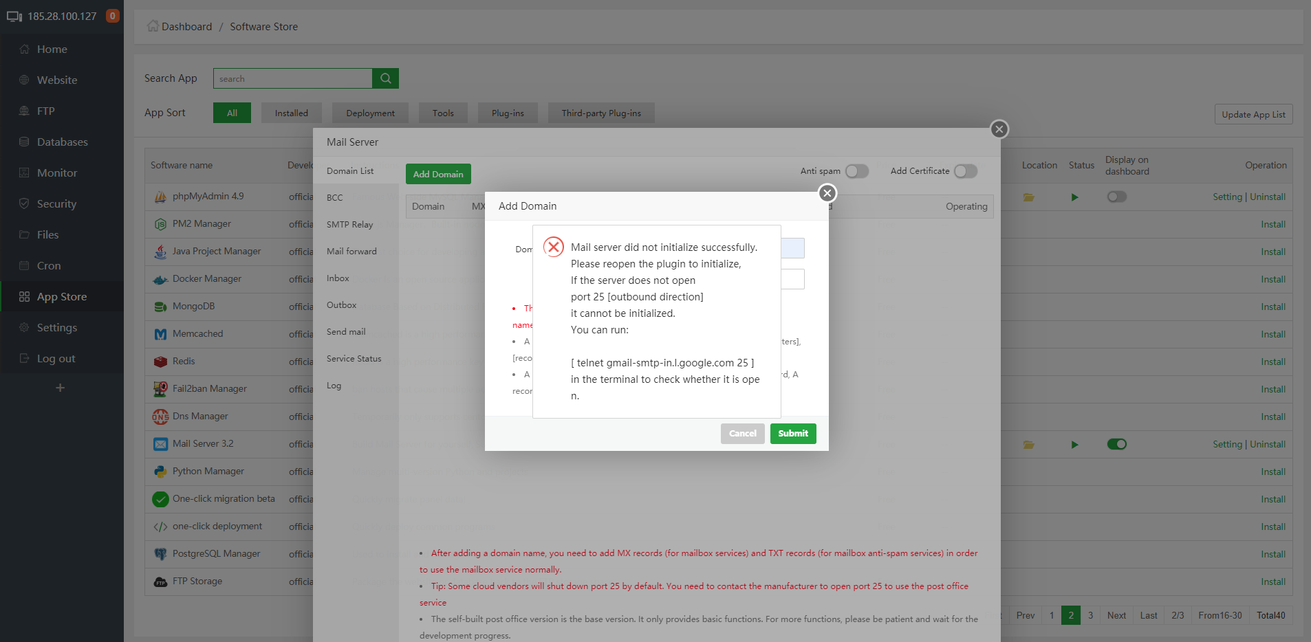 I'm trying to install a mail server in aapanel. I have debian 10, aapanel version 6.7.5 and a mail application 3.2.