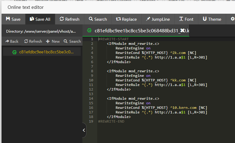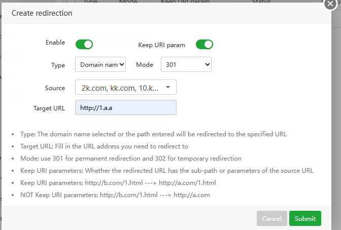 The redirect rule was added using the form created from pressing the button labeled "Add redirection".